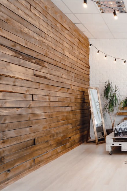 Niestandardowym i bardzo modnym materiałem wykończeniowym są aktualnie elementy pochodzące z rozbiórki starych domów i stodół. Drewno o takiej proweniencji ma wyraźny wzór, liczne sęki, przebarwienia i niejednolity odcień. W zależności od gatunku drewna i sposobu jego wykończenia ze starych desek można wykreować okładzinę o zróżnicowanej kolorystyce, fakturze i formie. Zazwyczaj jako punkt wyjścia stosuje się szerokie dyle, które układa się w pionie, poziomie albo na skos. Naturalność surowca z taką historią można podkreślić, łącząc różne formaty, grubości i kolory. Nierówności całej powierzchni boazerii są tu zabiegiem celowym. Na topie jest również stare drewno pochodzenia industrialnego – palety transportowe, skrzynki z oznakowaniem produktów spożywczych to przedmioty, których elementy z powodzeniem zdobią ściany wnętrz w stylu loftowym i industrialnym. Fabryczne stemple i oznaczenia na skrzynkach transportowych stały się oryginalnym deseniem okładzin.