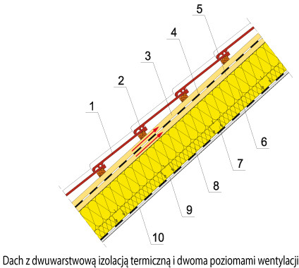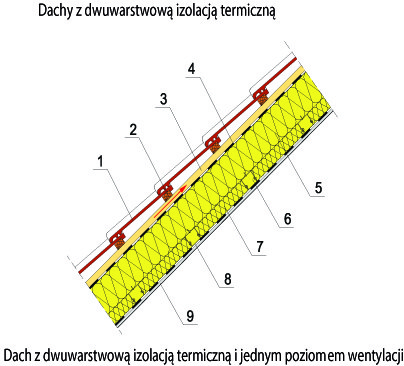 Montaż izolacji w dwóch warstwach pozwala na bardziej skuteczne ocieplenie niż układ jednowarstwowy, gdyż zwiększa łączną grubość izolacji oraz zmniejsza wpływ mostków cieplnych w przekroju przez krokwie. W przypadku rozwiązania dwuwarstwowego - krokiew jest osłonięta od dołu wełną URSA. Dzięki temu poprawia się izolacyjność dachu skośnego do 50 % w stosunku do rozwiązania wełny mineralnej jedynie między krokwiami. Grubość dolnej warstwy najczęściej wynosi 50-140 mm.