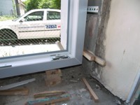Rys. 5 - Ustawiamy ramę okienną na wcześniej przygotowanych klockach i klinach dystansowych