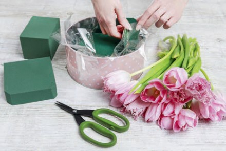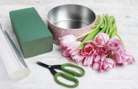 1. Do przygotowania kwiatowej kompozycji potrzebować będziemy: ozdobne pudełko po herbatnikach lub ciasteczkach maślanych; arkusz folii florystycznej; gąbkę florystyczną; nożyczki ogrodnicze lub lekki sekator ogrodowy; bardzo świeże tulipany o lekko rozwiniętych pąkach – w zależności od wielkości pudełka – 15-20 sztuk; makaroniki (lekkie, delikatne ciasteczka z białek i cukru z waniliowym lub owocowym nadzieniem).