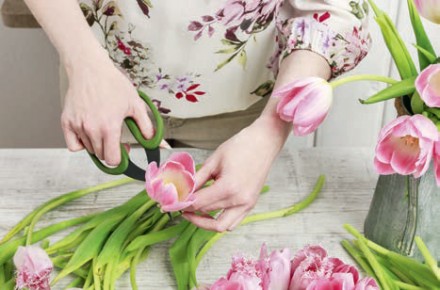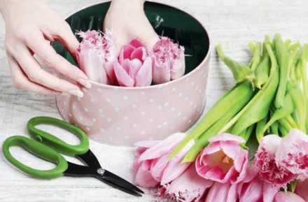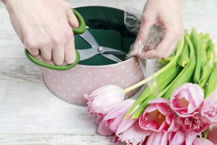 4. Przygotowujemy kwiaty. Odcinamy główki tulipanom z ok. 4 cm odcinkiem łodygi. Warto przymierzyć pierwszy kwiat – umieśćmy go w gąbce i sprawdźmy, czy wystaje dekoracyjnie ponad rant pudełka.