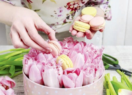 7. Na koniec delikatnie i pojedynczo układamy na kwiatowej kompozycji słodkie makaroniki. Dekorację możemy przygotować też jedynie w wersji kwiatowej. Jeśli wybierzemy tulipany o nietypowym kształcie, np. strzępiaste lub papuzie, wygląd będzie równie efektowny.