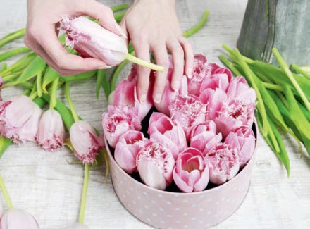 6. Kolor tulipanów warto dobrać do barwy pudełka. Wiosną są to kwiaty najpopularniejsze i tym samym dostępne w ogromnej liczbie ciekawych, różnorodnych odmian.