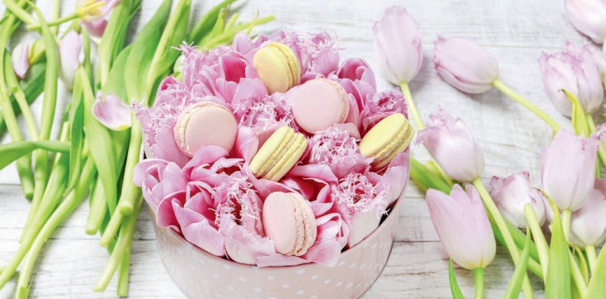 Wiosna obfituje w kwiaty, a także okazje do ich wręczania. Tradycyjny bukiet czy wiązanka mają swój niepodważalny urok, ale zrobią mniejsze wrażenie niż nasza łatwa do samodzielnego wykonania propozycja. Pięknie zaprezentowane, pełne świeżości tulipany w dekoracyjnym pudełku, a dodatkowo słodkie makaroniki – będzie romantycznie i apetycznie.