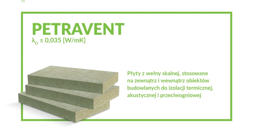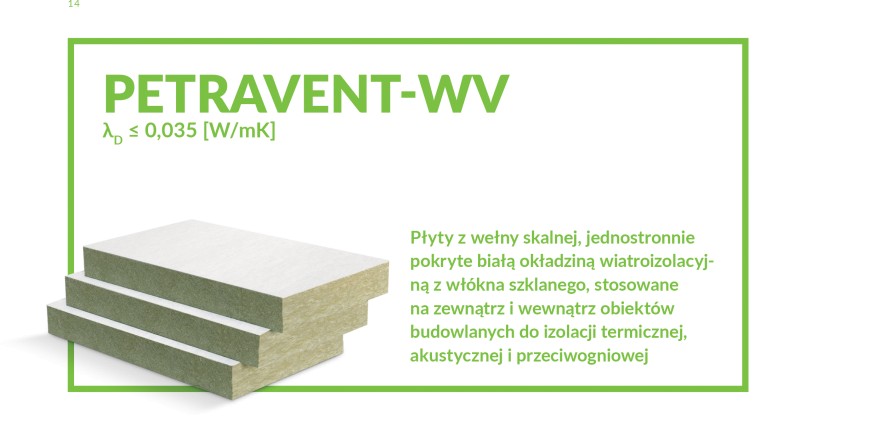 PETRAVENT-LV, PETRAVENT-V, PETRAVENT-HV – to grupa produktów stworzonych z myślą o elewacjach wentylowanych, których wspólnym mianownikiem jest jednostronne pokrycie czarną okładziną wiatroizolacyjną z włókna szklanego. PETRAVENT-LV to produkt o najniższej gęstości oferujący jednocześnie najniższy deklarowany współczynnik przewodzenia ciepła 0,034W/mK, a tym samym oferujący najlepszą zdolność do izolacji termicznej. PETRAVENT-V jest wełną należącą do produktów o średniej gęstości, dostępną także w wariancie z pokryciem z białego welonu PETRAVENT-WV. Wśród produktów budowlanych, pozwalających spełnić najbardziej rygorystyczne wymagania w zakresie bezpieczeństwa pożarowego, znajduje się PETRAVENT-HV. Jest to produkt o najwyższej gęstości, która w sposób zasadniczy wpływa na zwiększenie odporności przegrody na działanie ognia, opóźniając tym samym rozprzestrzenianie się pożaru. Produkt ten oferuje także najwyższą twardość spośród grupy produktów z welonem, przeznaczonych do elewacji wentylowanych, oferując tym samym najlepsze parametry fizyczne określające zdolność do odkształceń.
