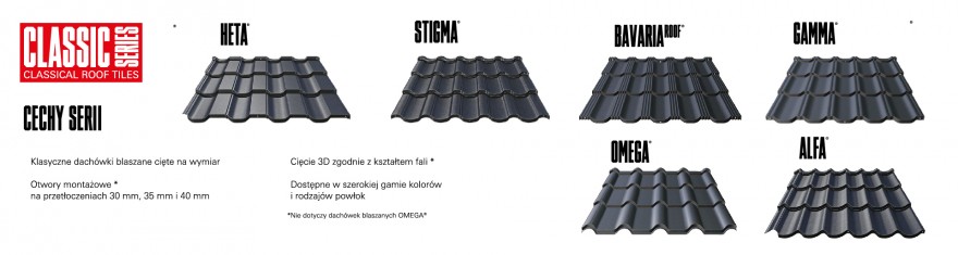 Serię CLASSIC reprezentują blaszane pokrycia dachowe idealnie dopasowane do projektu dachu ALFA®, OMEGA® i GAMMA®, w 2020 roku dołączyły do nich premierowe profile HETA®, BAVARIA®Roof i STIGMA.  Profile dachówek klasycznych są produkowane w formie arkuszy blachy ciętej na konkretny, zamówiony wymiar.