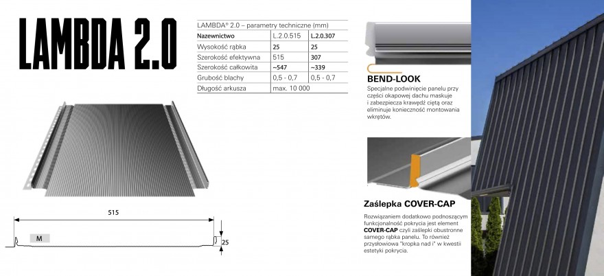 • LAMBDA 2.0 dostępna jest w dwóch szerokościach panelu  515 mm oraz 307mm i czterech rodzajach profilowania, co pozwala na idealne dopasowanie do potrzeb konkretnego budynku.