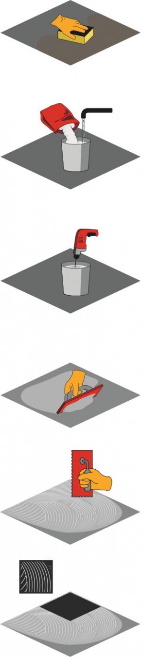 Narzędzia użyte do układania płytek można zmyć wodą, zanim klej stwardnieje. Po stwardnieniu kleju narzędzia można czyścić tylko mechanicznie. Wszelkie zabrudzenia płytek, usunąć zanim klej zaschnie na powierzchni używając wilgotnej gąbki lub szmatki.
