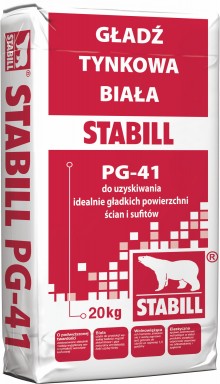 STABILL PG–41 króluje na rynku gładzi gipsowych już od 17 lat i jest naszym najpopularniejszym produktem w swojej kategorii. Dzięki niepowtarzalnym i unikalnym właściwościom, produkt jest rozpoznawalny i doskonale sprzedaje się od wielu lat. Gładź tynkowa PG-41 służy do wyrównywania i wygładzania wszelkich powierzchni mineralnych występujących na budowach - od lanego betonu, przez wszelkiego rodzaju tynki, po płyty gipsowo-kartonowe. PG-41 można również zastosować do wykonywania połączeń płyt gipsowo–kartonowych z zastosowaniem taśmy zbrojącej.