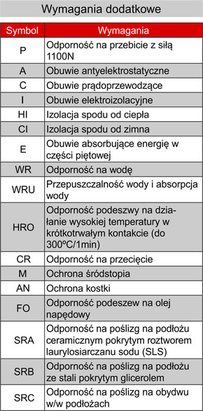 Normy określają podstawowe wymagania dla obuwia będącego ochroną indywidualną, a także określają system kategorii i właściwości obuwia. Ich graficzną  wizualizacją są symbole umieszczone na wyrobach.  Przykładowo: SB, S1do S5 – obuwie bezpieczne (wyposażone w podnosek), OB, O1-O5 – obuwie zawodowe (bez podnoska). Oprócz podstawowej kategorii na etykietach można także znaleźć informacje o tym, że dany model obuwia spełnia tzw. wymagania dodatkowe. Jeśli zatem na etykiecie odnajdziemy zapis: S1 SRA oznaczać to będzie, że dany model buta należy do grupy obuwia bezpiecznego (spełnia wymagania normy EN ISO 20345), posiada podnosek, podeszwa jest odporna na olej napędowy oraz ma właściwości antyelektrostatyczne, część piętowa podeszwy absorbuje energię (amortyzuje w czasie chodzenia), jest także zabudowana. Natomiast oznaczenie SRA informuje, że dany model spełnia tzw. wymagania dodatkowe, a w tym przypadku jest to odporność na poślizg na podłożu pokrytym glicerolem.