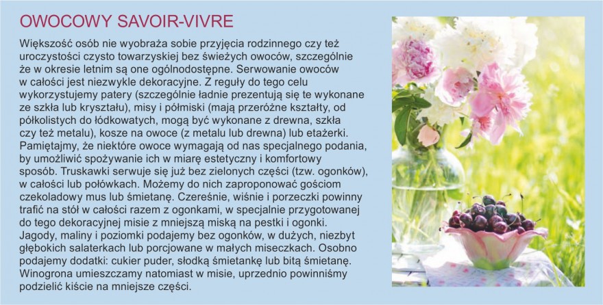 Nic też nie stoi na przeszkodzie, by rodzinnym posiłkom w ogrodzie, na tarasie lub balkonie nadać niezwykły klimat,  przywodzący na myśl wakacje spędzane w egzotycznych krajach! Mając latem do wyboru całą masę świeżych owoców, również z własnego ogrodu, nietrudno zaaranżować na przykład podwieczorek z lekkimi owocowymi przekąskami. Są one łatwe i szybkie do przygotowania, ale powinny być także efektowne, tak aby nie tylko ich smak, ale też walory wizualne przeniosły nas  w wyobraźni pod palmy, nad brzeg krystalicznego oceanu. W upalne dni możemy przygotować dla siebie owocowy poncz, a dla dzieci orzeźwiającą lemoniadę – napoje te świetnie nadają się do podania w słoju z kranikiem. Niezależnie od składników jakich użyjemy do jej przygotowania, lemoniada znika jako pierwsza! Dobrym pomysłem są również owocowe lody czy kolorowe owocowe koreczki. Za pomocą owoców nasze rodzinne podwieczorki będą ucztą nie tylko dla ciała, ale również dla oczu!