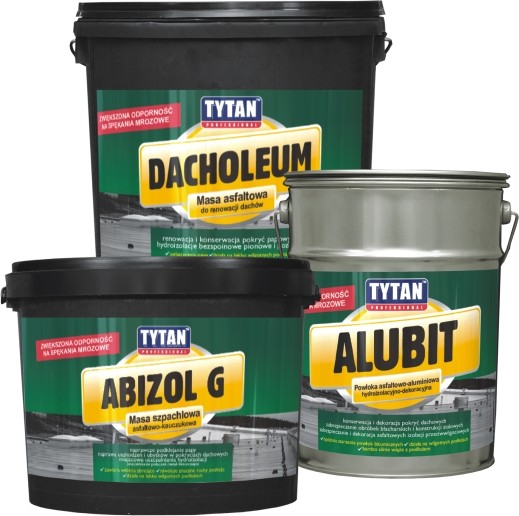 Do wykonywania bitumicznych hydroizolacji dachów, Tytan Professional poleca preparaty na bazie rozpuszczalników - Abizol R, Abizol KL DM, Dacholeum, Abizol P, Alubit oraz na bazie wody - Disprobit Grunt Koncentrat oraz Disprobit.