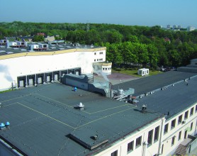 System dachowy : 1.Podłoże żelbetonowe; 2.Folia paroizolacyjna o grubości 0,2mm; 3.Płyta styropianowa EPS-100-038; 4.Przekładka z welonu z włókien szklanych; 5.Papa podkładowa LEMBIT O P-V70 S30; 6.Papa wierzchniego krycia LEMBIT NRO;7.Łącznik mechaniczny teleskopowy.