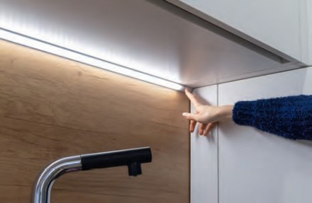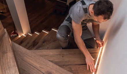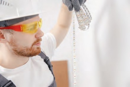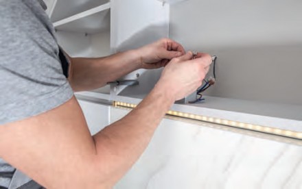 We wnętrzach przeważnie wykorzystujemy taśmy przystosowane do napięcia 12 V. Najczęściej stosujemy zewnętrzny zasilacz, którego montaż wymaga odpowiednio dużo przestrzeni – po instalacji zasilacza najlepiej miejsce montażu zamaskować, tak aby było niewidoczne. Jeśli tam, gdzie zaplanowaliśmy usytuowanie zasilacza nie ma przygotowanego zasilania, należy je doprowadzić z puszki rozdzielczej lub najbliższego gniazdka. Trzeba też pamiętać, że jeden zasilacz wystarcza na 6 m taśmy. Gdy planujemy więcej oświetlenia liniowego, konieczna będzie większa liczba zasilaczy. Jednak dzisiaj podłączenie do stałego źródła prądu nie jest już koniecznością, na rynku są dostępne taśmy z opcją zasilania bateryjnego. Taśmy z diodami RGB wymagają sterownika. Jeśli nie ukryjemy w bruzdach ściennych lub w pustce pod okładziną z płyt g-k instalacji, zasilacza, sterownika czy przewodów, pozostaną one widoczne i będą szpecić wnętrze, a efekt estetyczny będzie bardzo połowiczny. Taśmy LED najlepiej montować w profilach aluminiowych, które dobrze odprowadzają ciepło i wydłużają ich żywotność. W przypadku, gdy zostaną przyklejone bezpośrednio do drewna, płyt kartonowo-gipsowych lub ściany murowanej tracą szybciej nie tylko trwałość, ale też moc świecenia.
