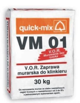 3. VM 01 - specjalna zaprawa murarska do wznoszenia murów elewacyjnych ze słabo nasiąkliwych cegieł licowych o nasiąkliwości 3-8% z jednoczesnym pełnym i gładkim wykonaniem spoin.